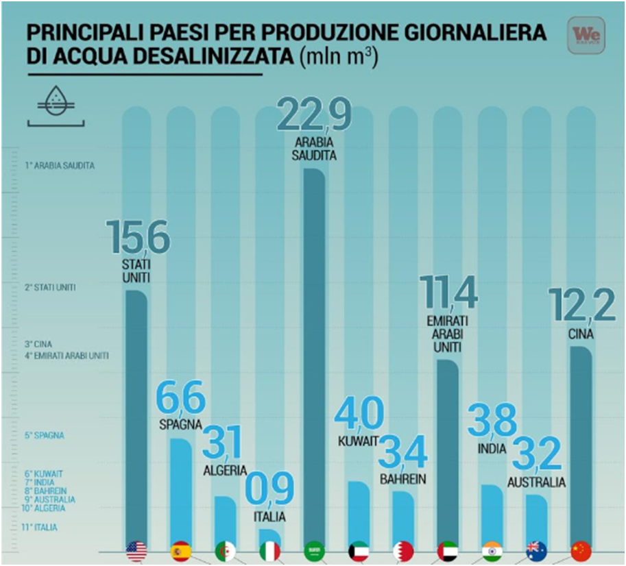 Queste tecnologie sono già largamente utilizzate in paesi più poveri di acqua come il Medio Oriente, tuttavia in Italia non ne viene ancora fatto uso in larga scala. L’Italia oggi ha una produzione di acqua desalinizzata di appena il 4% rispetto al consumo totale, contro il 56% della Spagna o il 26% dell’Australia.